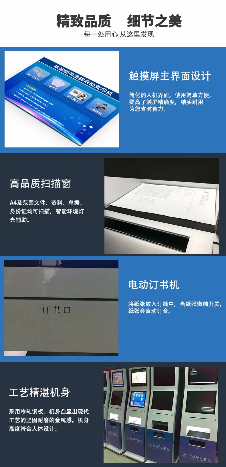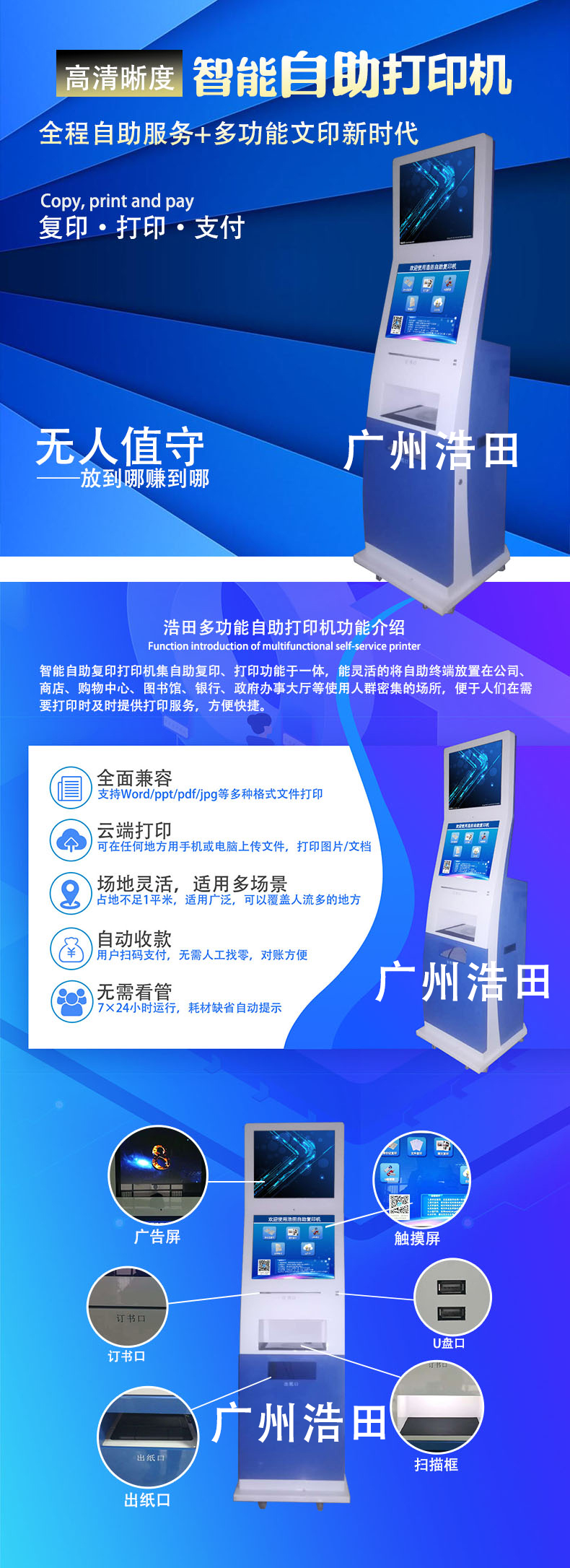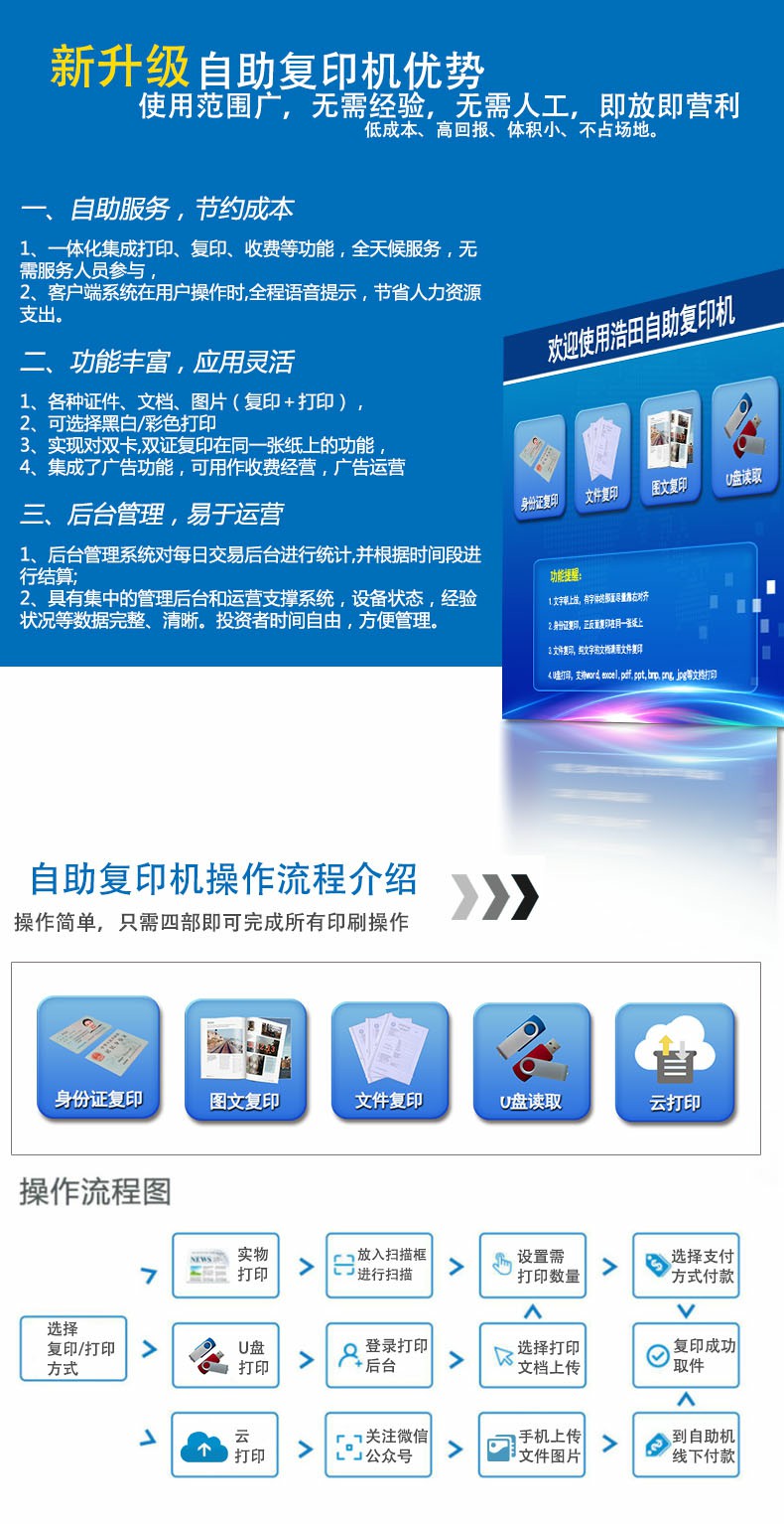 自助復印機市場前景:共享智能復印系統在校園打印設備上有足夠的驚艷,它的使用操作方法簡單,支付方式多樣,能為廣大師生提供一個便捷的復印打印平臺。廣州浩田自助終端系統聯系電話:400-030-2780