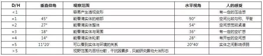 景區拍照抓拍系統怎么放置?首先考慮景點與游客視線的關系,這種關系取決于視線距離和物體高度之比(D/H),一般來說D/H大體在1:3之間,游客視線設計取垂直視角18°,水平視角36°。作為普通觀光時,這個角度是視覺開始渙散的界線,這種距離會使游客去注意到與周邊物體的關系。當視角為45°時,注意力會相對集中,這時候游客容易觀察到周邊景物的細部。當視角為30°時候,游客容易看到景物立面的細部。當視角為14°時,游客傾向于將景物看成突出于整體背景中的輪廓線(圖2,表1)。