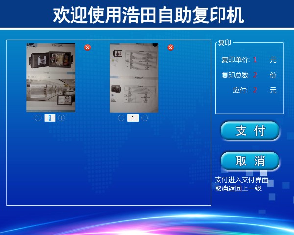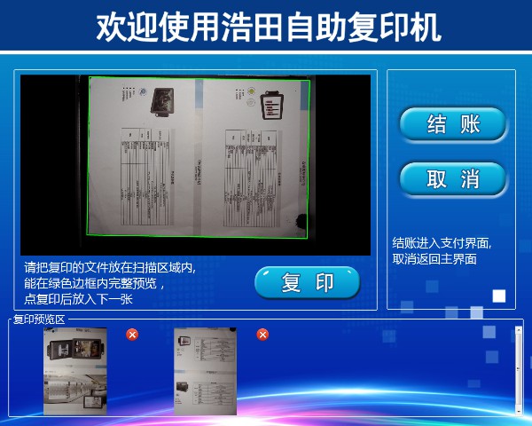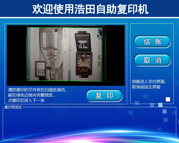 把文檔/圖片放入掃描框內(nèi),自動識別掃描進系統(tǒng),在預(yù)覽區(qū)顯示,點擊【結(jié)賬】后后按照您復(fù)印的內(nèi)容加減份數(shù),最后點【支付】