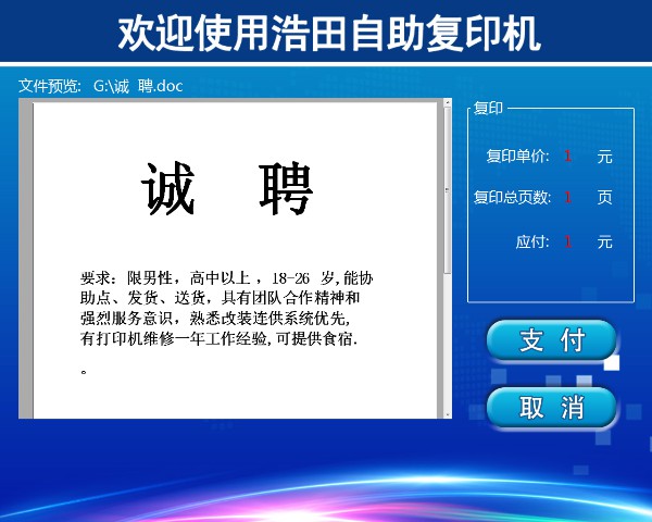 在界面上找出要打印的文件,點擊然后按【確認】,在預(yù)覽區(qū)預(yù)覽無誤后點擊【支付】。