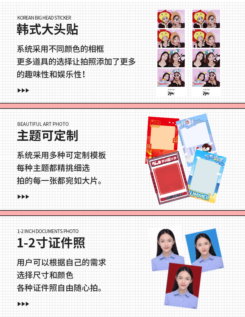 產品特點:這款大頭貼自拍機可電動升降鏡頭,滿足不同身高需求的人可直接按鍵上下移動鏡頭,非常的便捷智能化,并且軟件上更是加了AI寫真的功能,有趣好玩的拍照屋投放地點建議在年輕人密集的商場、電玩城、網紅店鋪等有消費力的場地建議投放一臺至兩臺機器以上。